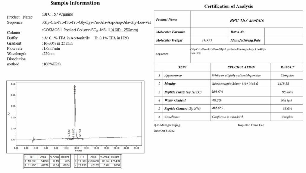 Many online lab reports only include the purity result with no quantity analysis, so it may show 99% purity, but a 5mg vial may contain just 1mg of active peptide or worse, contain double the quantity creating a dangerous situation for researchers when planning their research.
